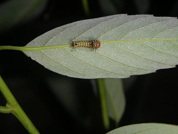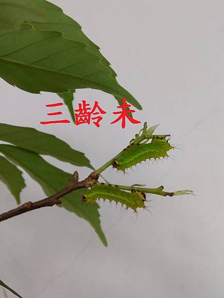 | 三齡幼蟲:體色和二齡幼蟲頗相似,二側明顯白線條,黃色肉棘突起。 |