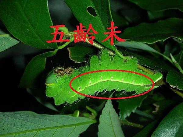 | 五齡幼蟲:體色和四齡幼蟲相似,口部轉綠色,二側白線條變比較明顯。 |